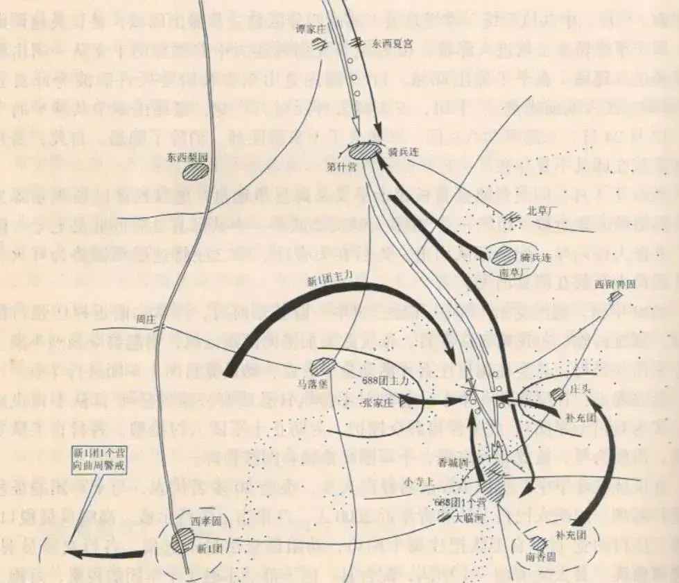 敌军一路南下,在香城固遭遇688团1营的阻击,尽管迅速冲锋却未果,部分兵力被迫向庄头方向解围,意图迂回香城固侧后。