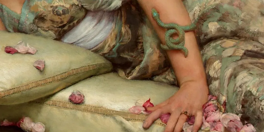 除了花瓣,塔德玛对于画面细节的追求也令人叹为观止: 女人佩戴的绿石榴石蛇形首饰