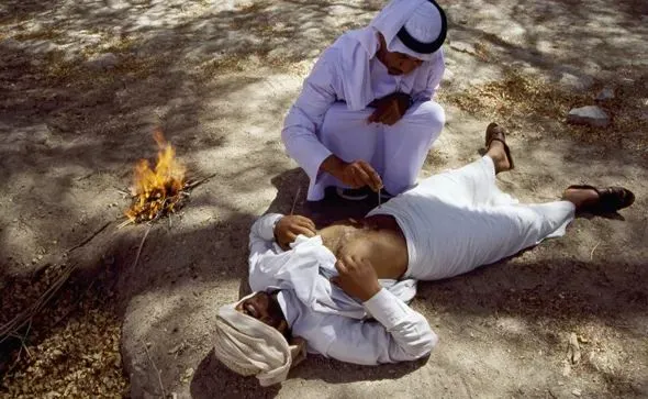 在Al Ain,一位传统治疗师展示了古老的贝都因人治疗技术,这种方法是将热金属敷在病人的胃部,类似于针灸。