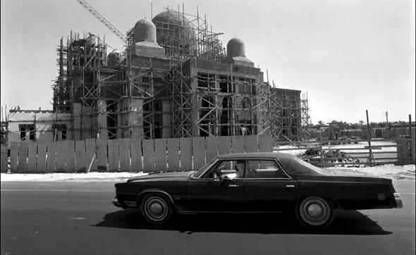 一名男子驾驶着汽车经过如今仍是标志性建筑的朱美拉清真寺,这座清真寺于1978年竣工。(现在它周围满是商店。)