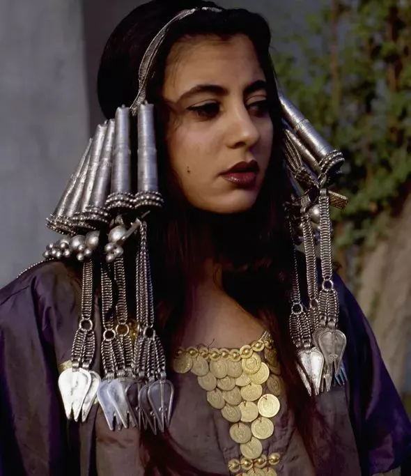 照片中,一位女性戴着贝都因人传统的结婚头饰——这种银饰通常是新娘婚礼时嫁妆的一部分。