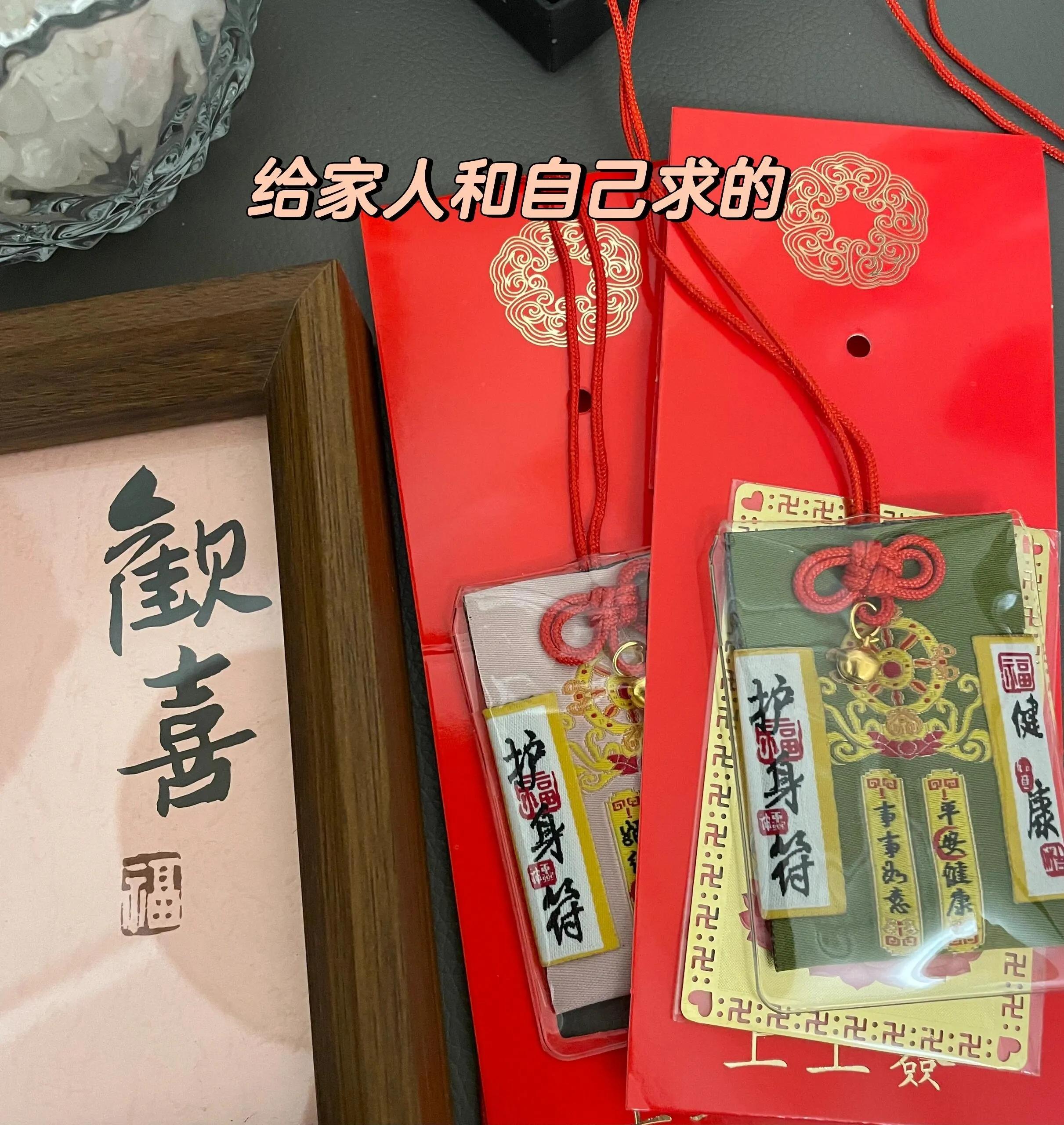 我是在观音殿门前买的符,有求平安、健康、开运、姻缘、招财等各种符咒、挂饰和手串。买符前我用鲜花拜佛,买了之后就拿着符一起拜。
