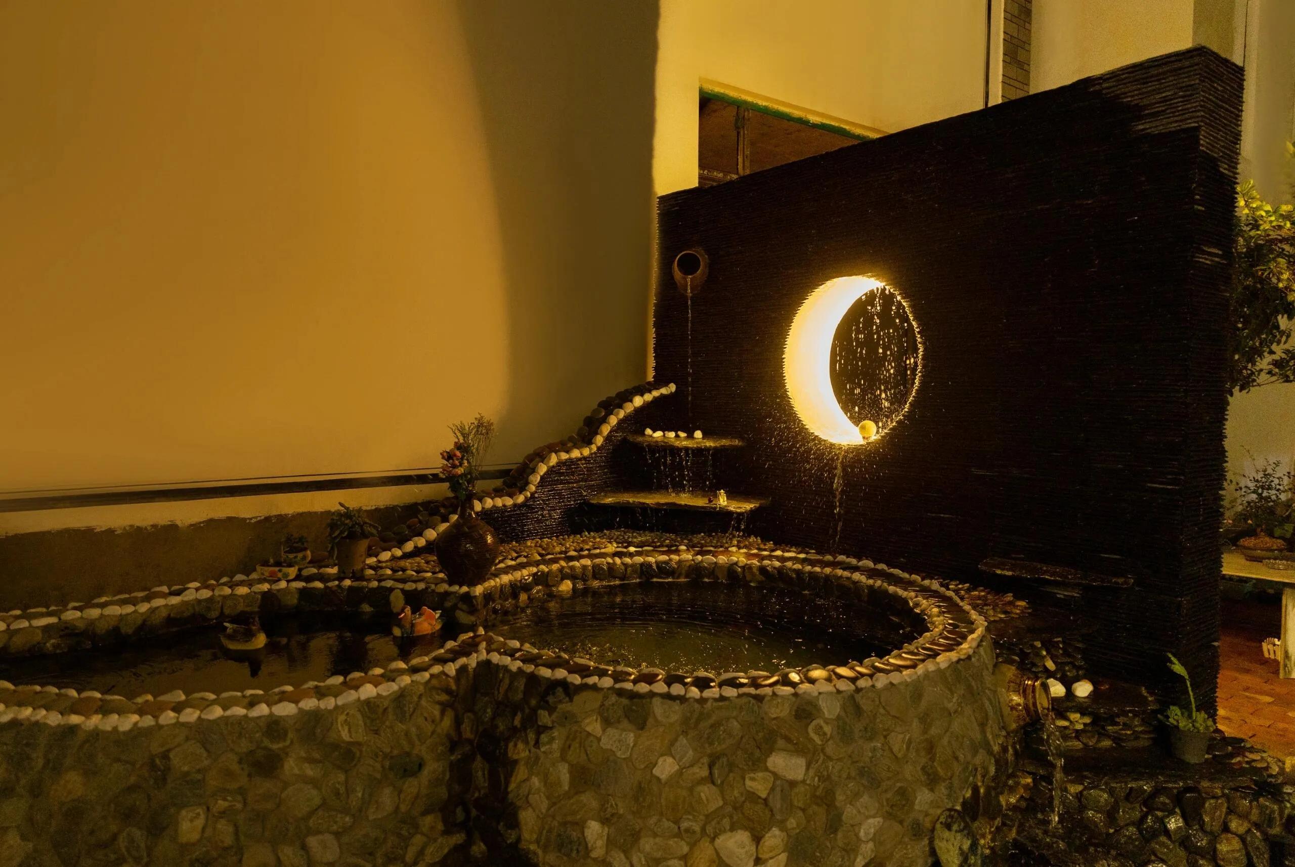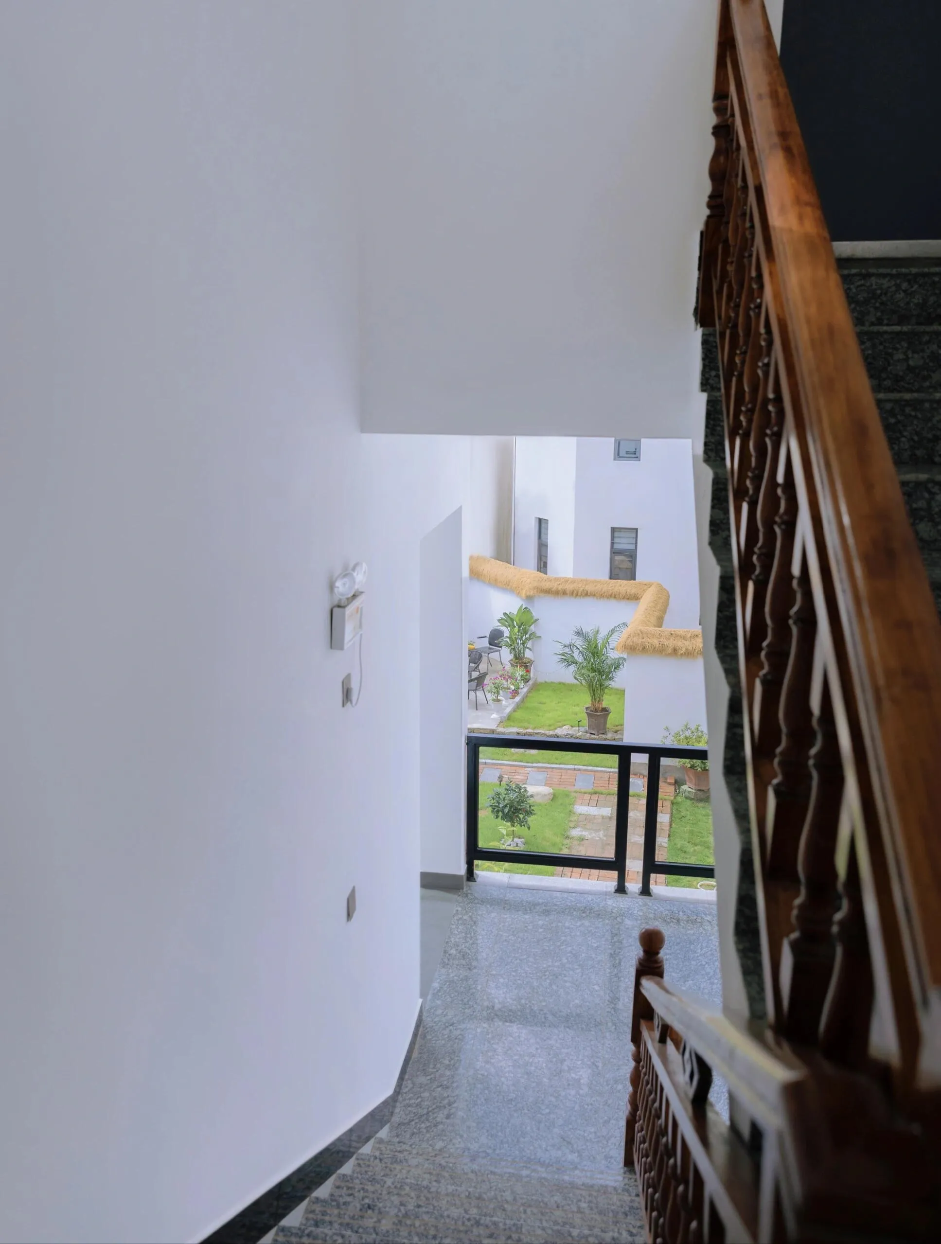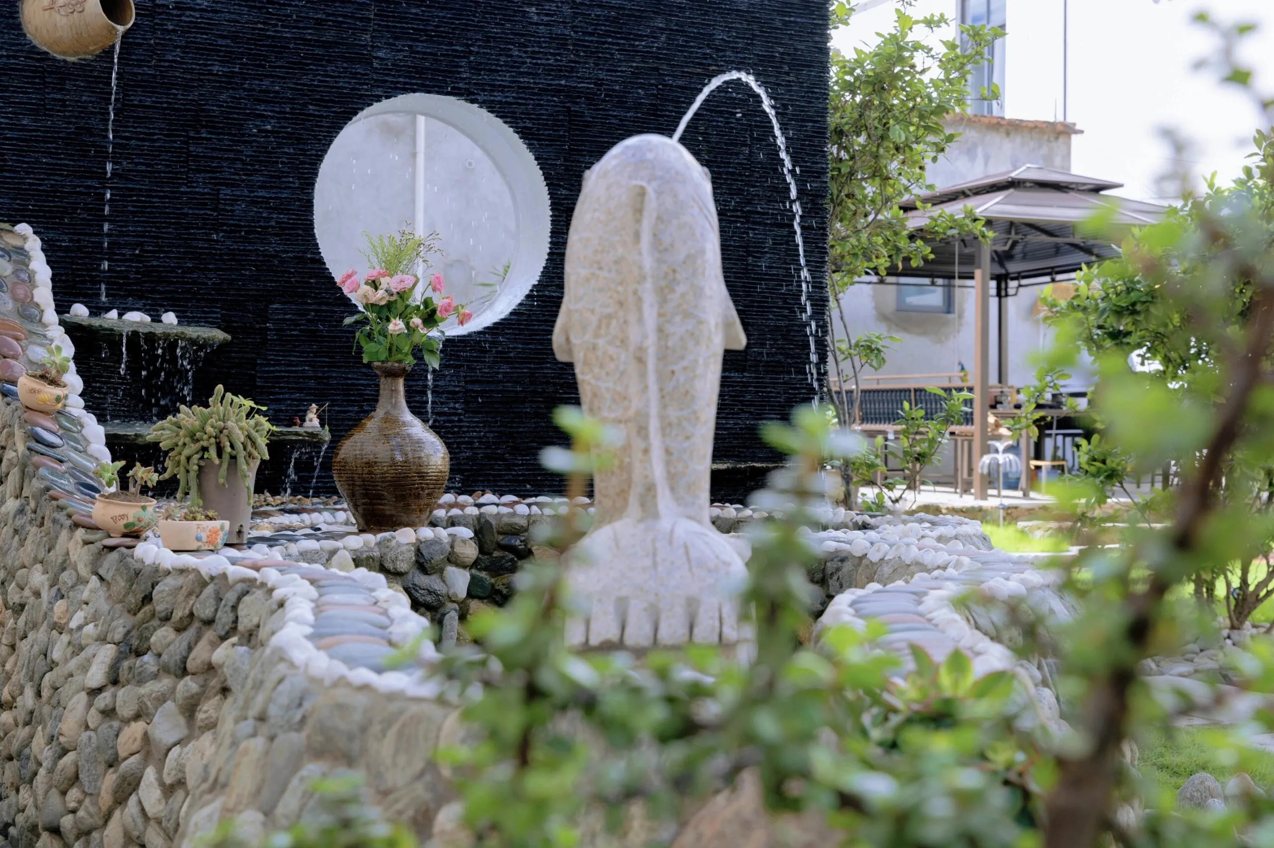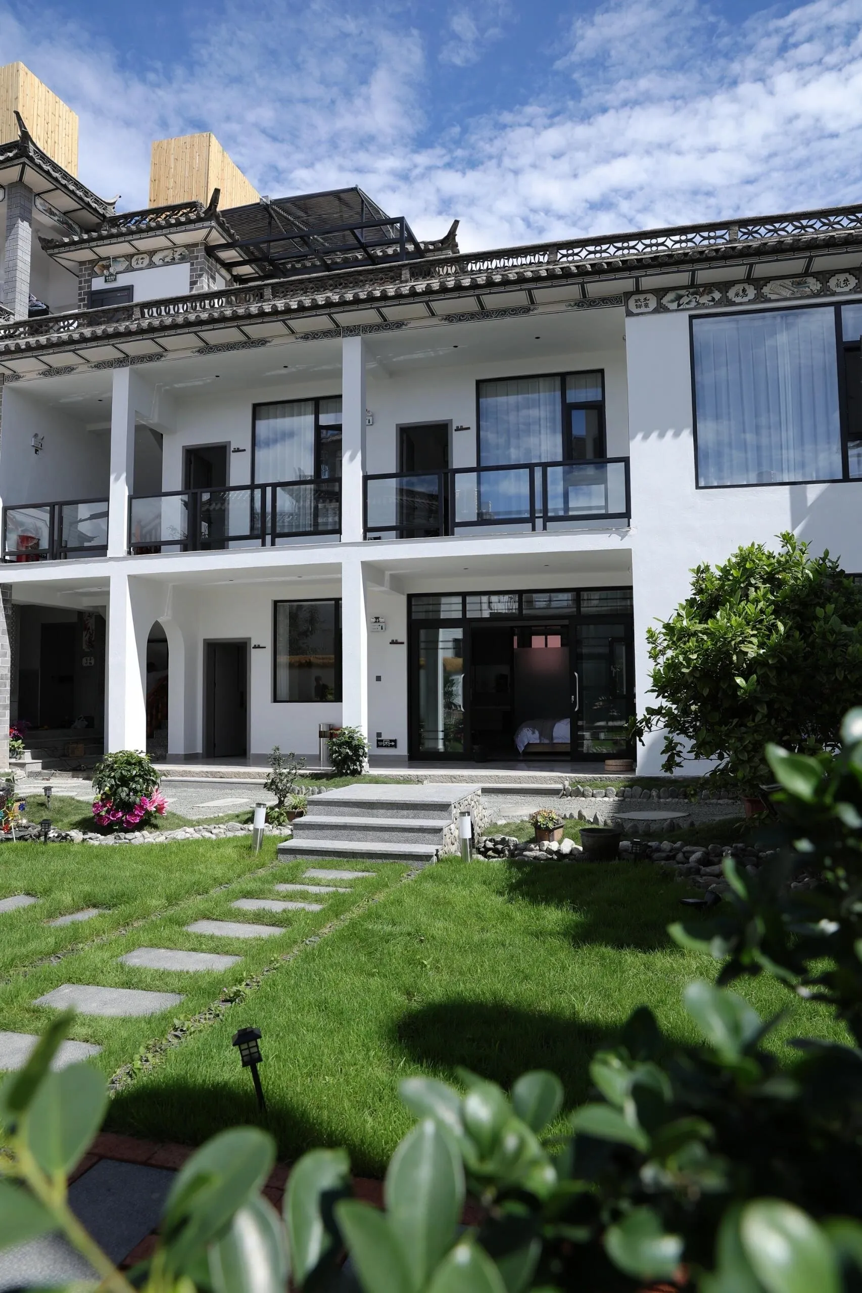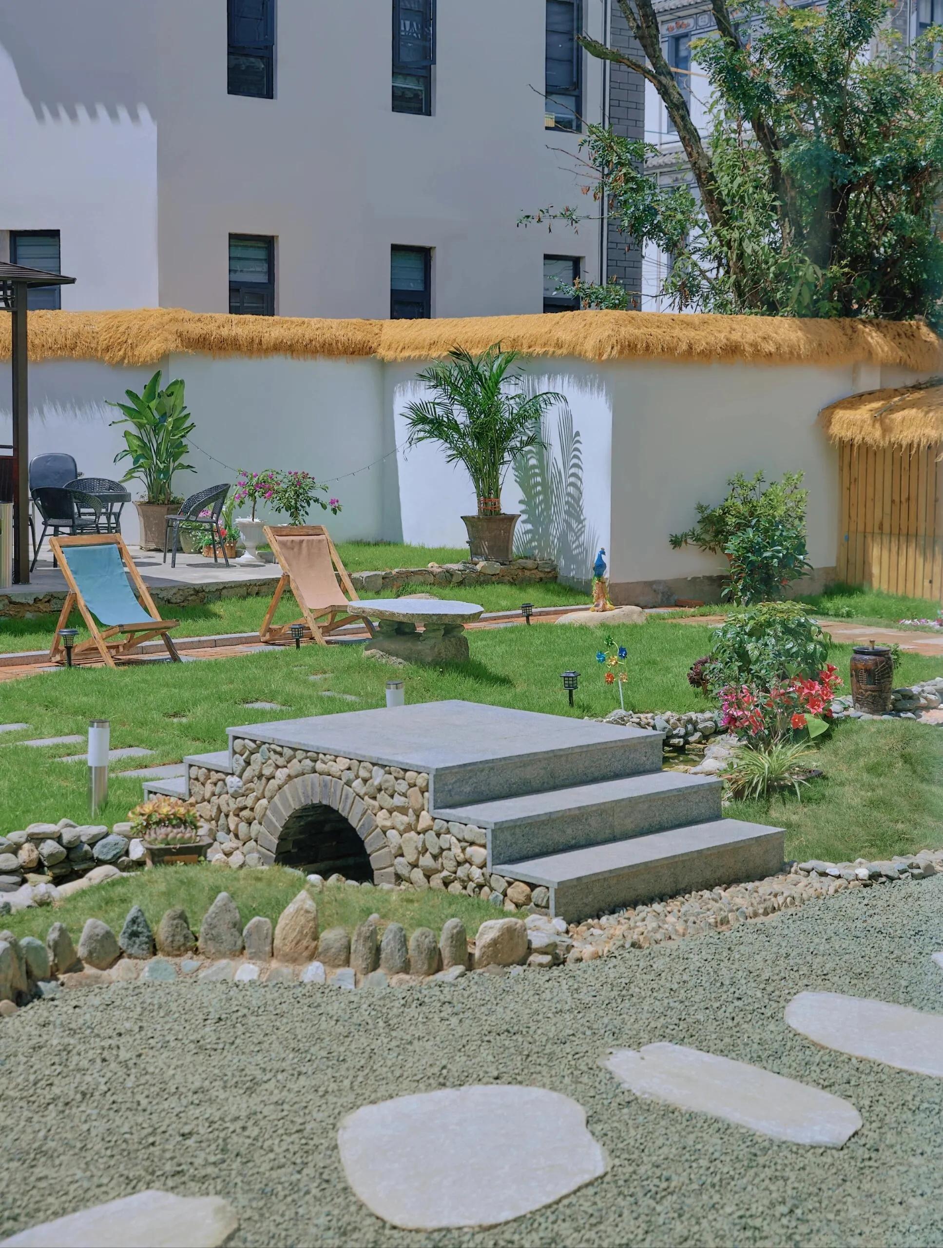 民宿院落景致优美,小桥流水,茶室雅致,让人身心愉悦。从阳台俯瞰院落,更是别有一番风味。