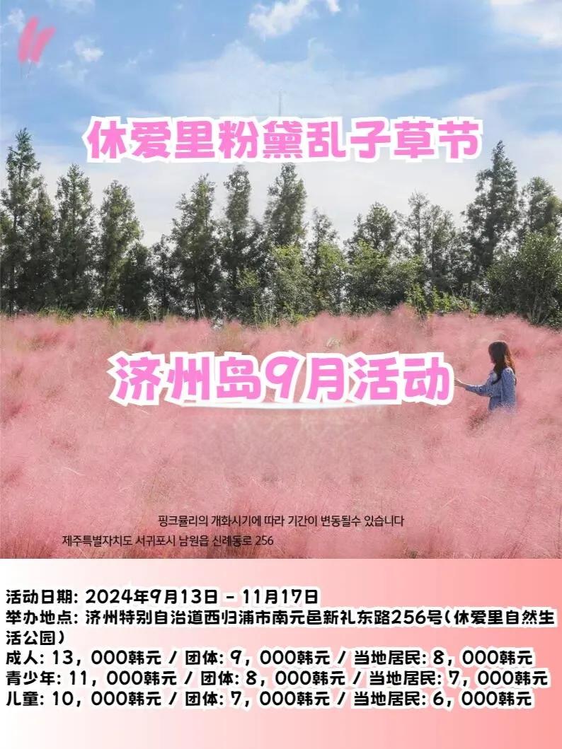 济州岛粉黛乱子草节是当地最浪漫的庆典之一,让游客仿佛置身画卷中的粉红色花海。2024年的粉黛乱子草节将于9月13日至11月17日在休爱里自然生活公园举行,比往年更加丰富多彩,已成为济州岛旅行的必打卡之地。