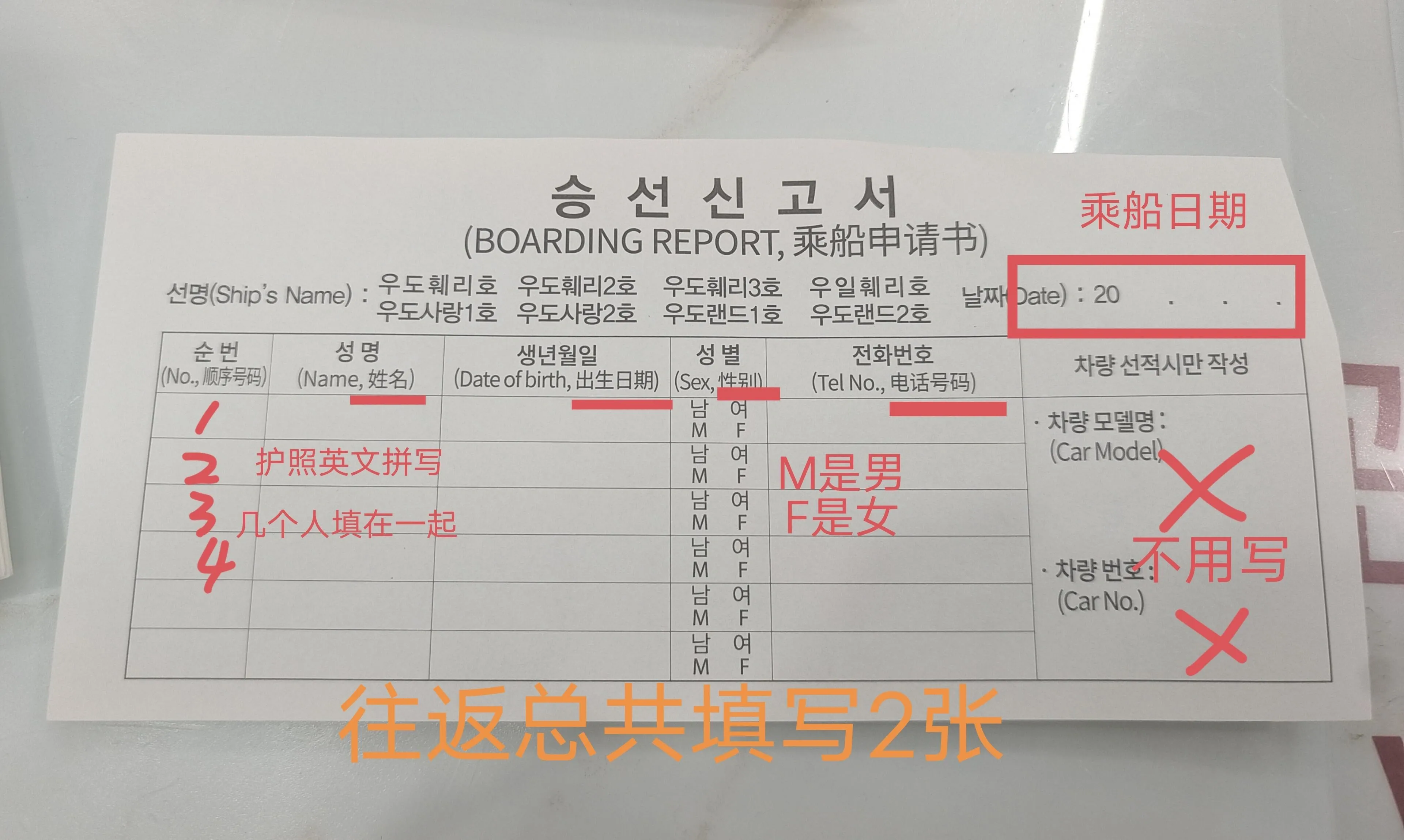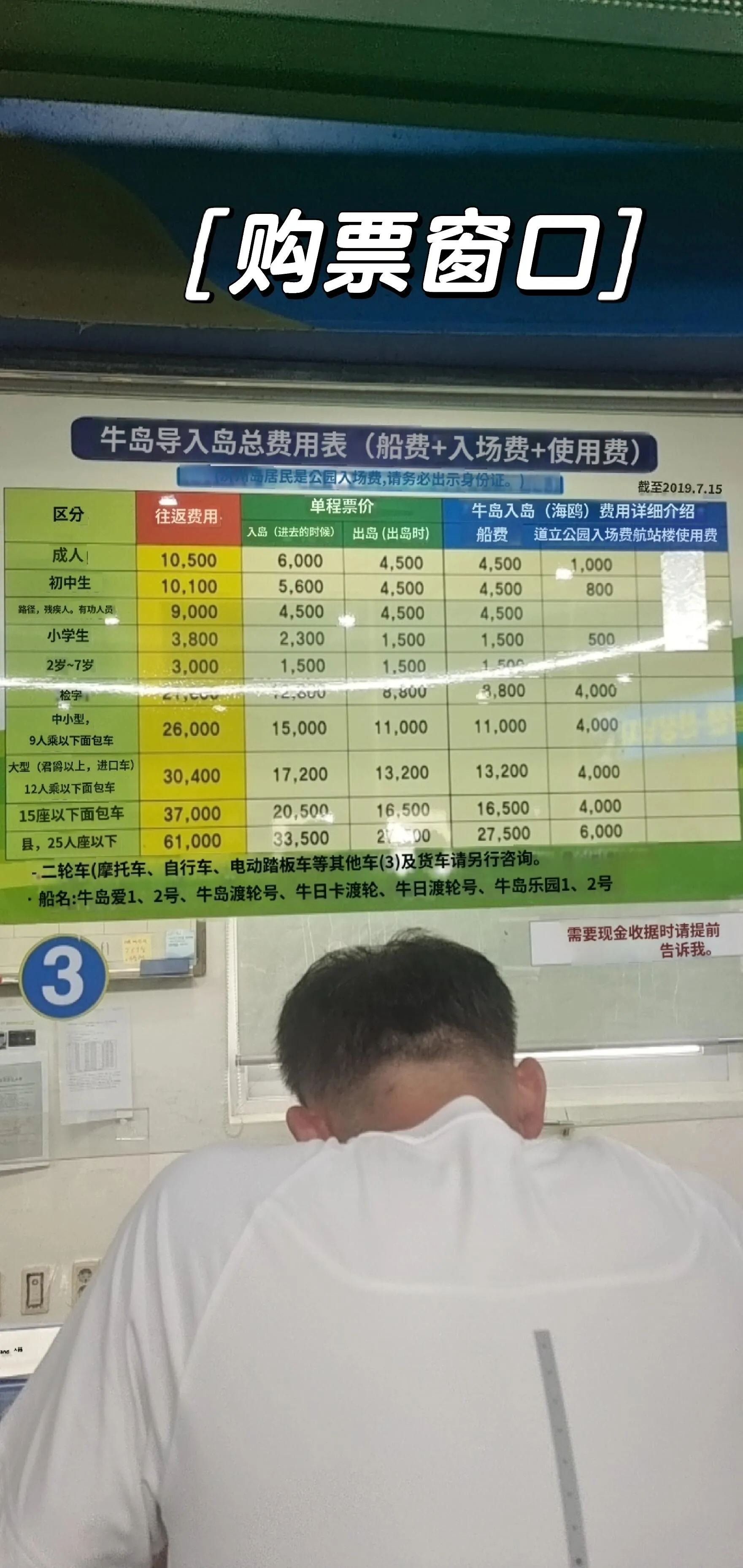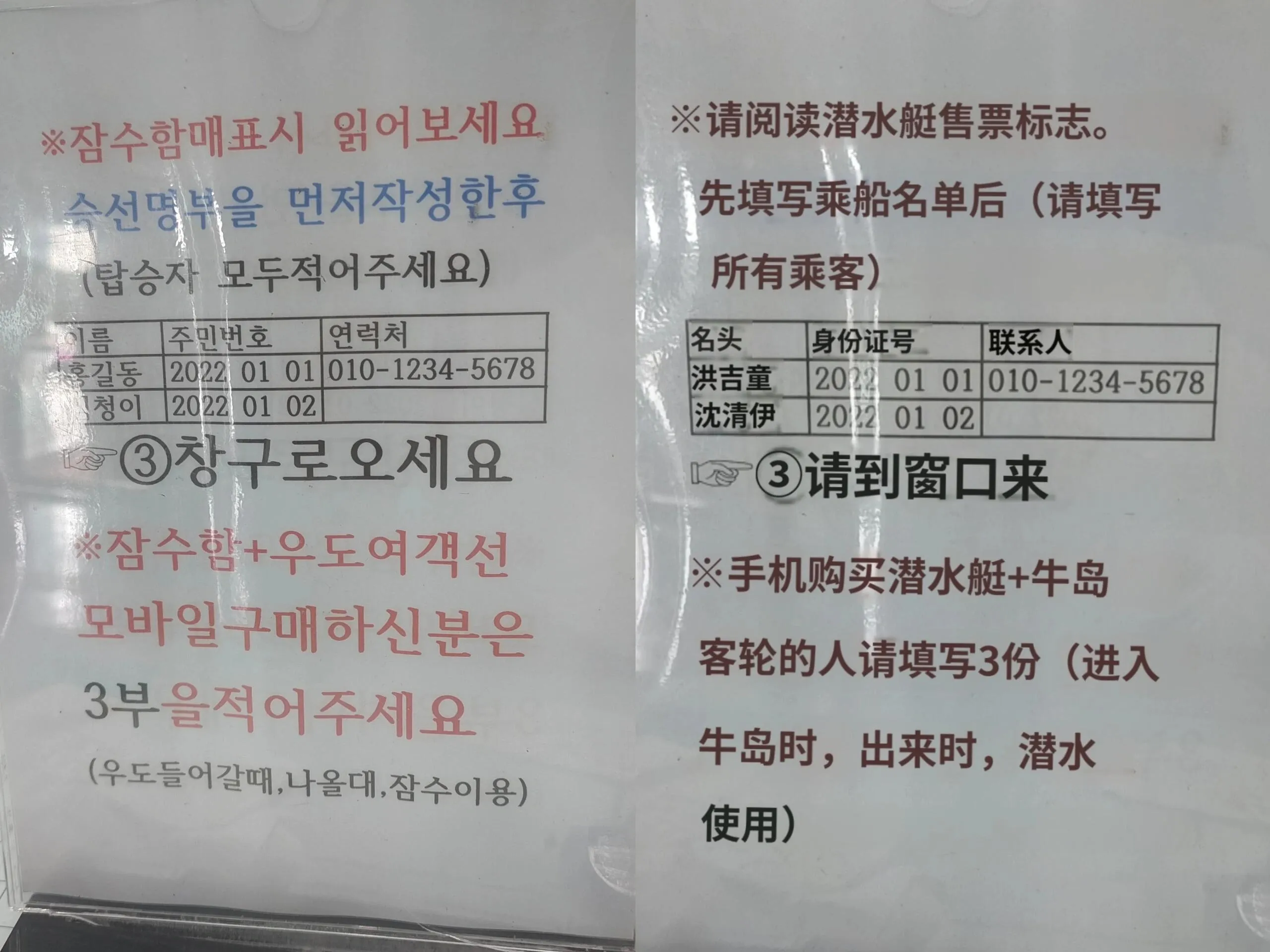 进入购票大厅后,首先要在桌子上填写单子,注意是先填单后买票。船票是一次性买往返的,需要填写两张单子,所有出行人的信息填在一张单子上。一定要保管好,上船时工作人员会收走一张,回程时再收走一张。