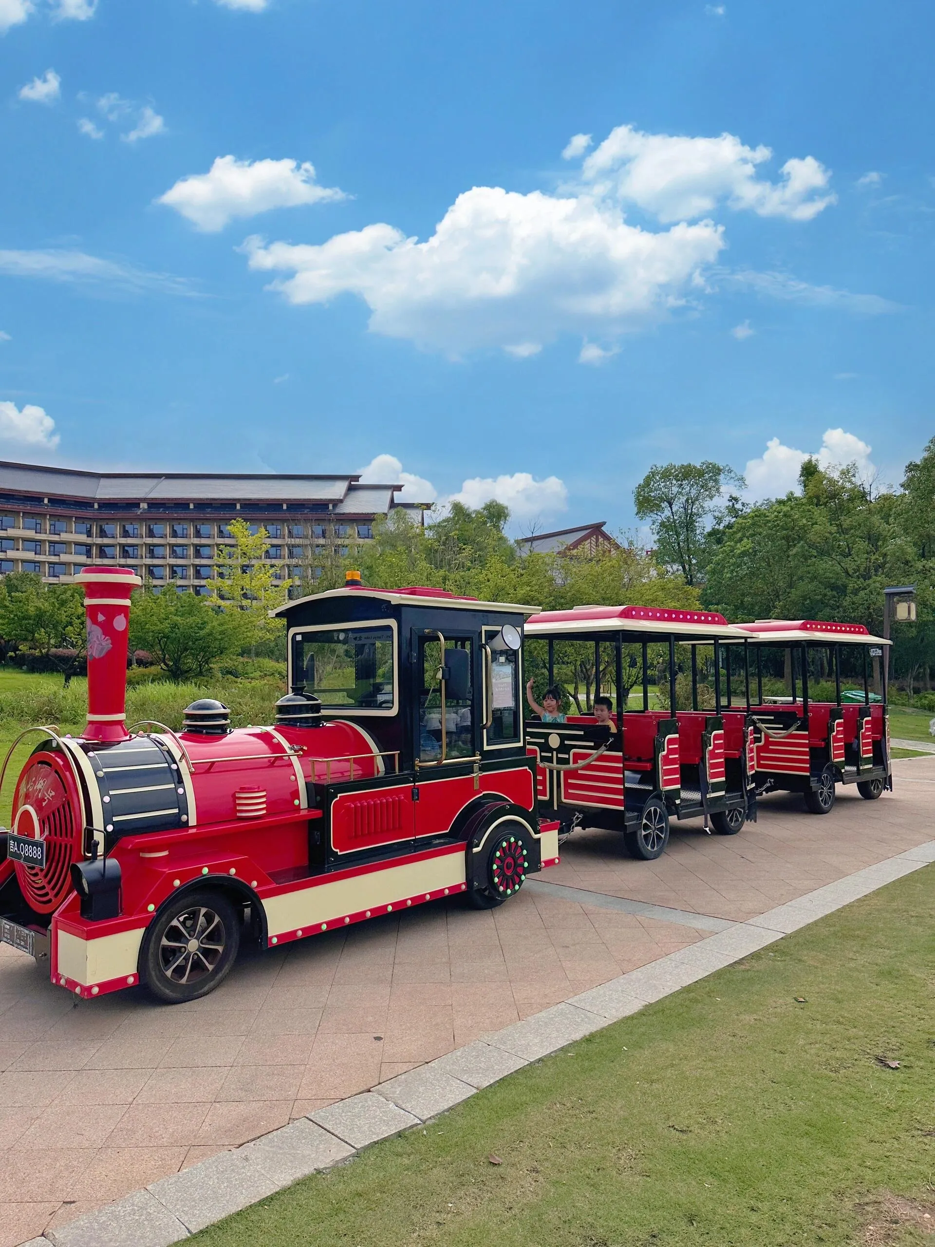 酒店B区有户外泳池,再往前有一片沙滩。坐上网红小火车游园,吹着风真是舒服极了!