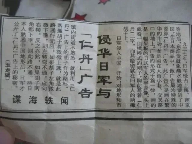 其后,国民政府逐渐察觉“仁丹”广告的异样,抗战全面爆发后,发布命令在全国范围内大规模涂掉“仁丹”广告。